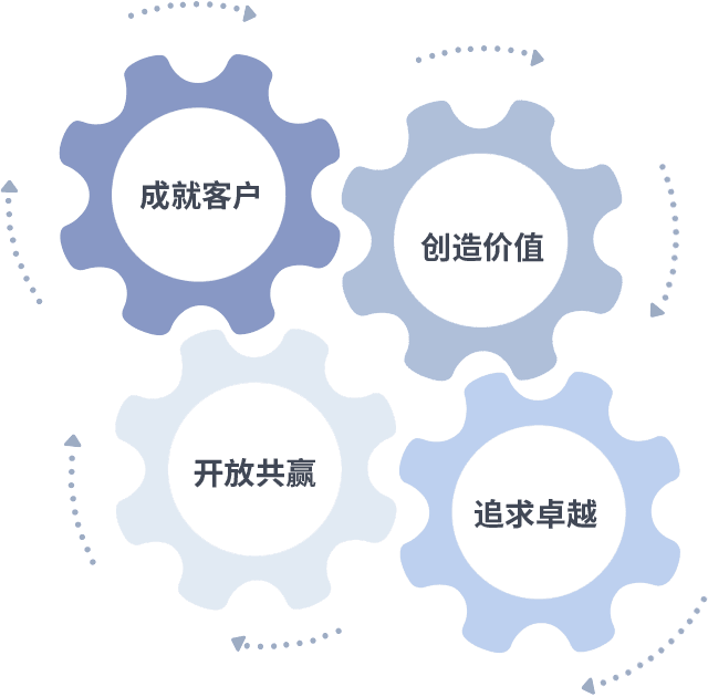 成就客户是一切决策的出发点,,创造价值是衡量所有工作的标准,,,追求卓越是我们做事做人的态度,,开放共赢是我们的格局也是最终的结果。。。价值观的齿轮环环相扣,,推动着组织里的每个人不断向前。。