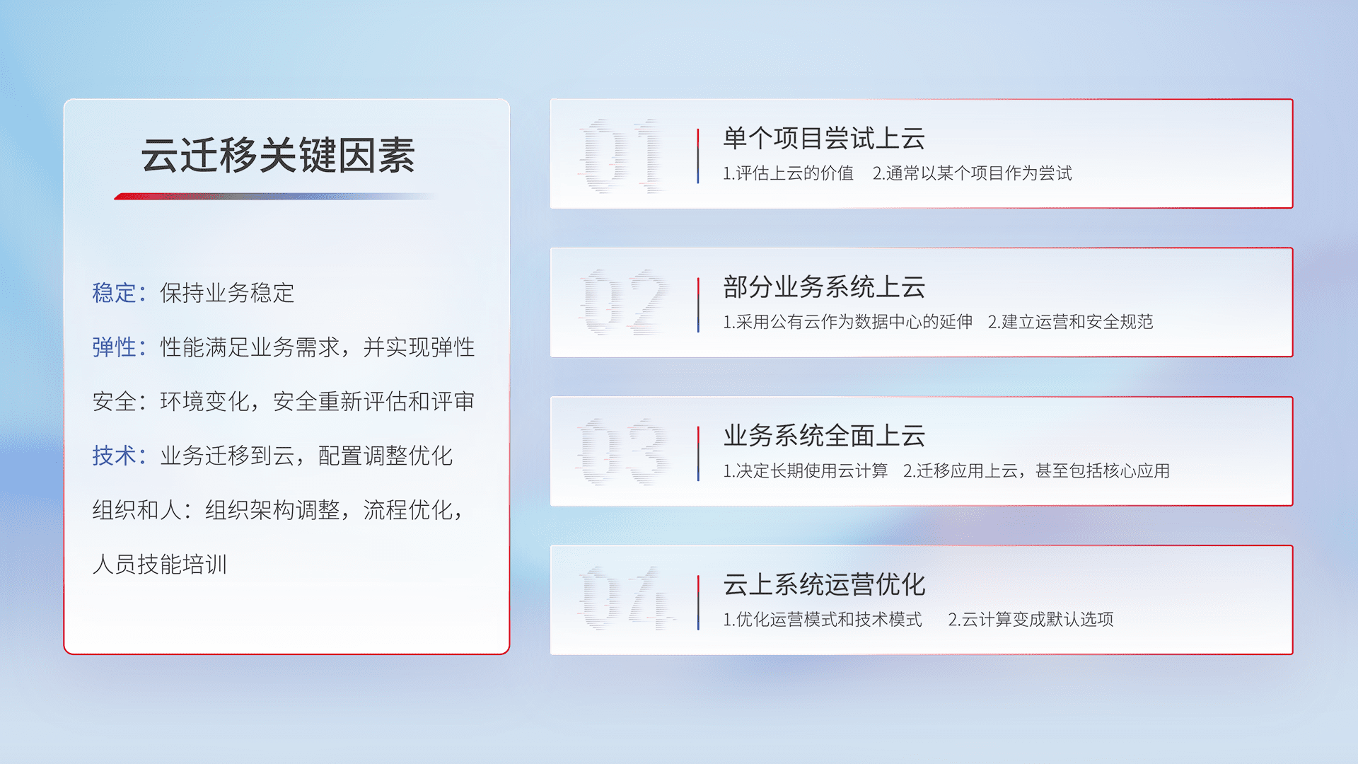 结合实际业务,,,从规划设计、、、云平台选型、、、、云原生改造、、、数据迁移、、、集成交付,,迁移全过程为客户识别最佳上云路径,,做好风险识别管理,,设计网络架构、、身份权限、、、安全审计合规、、、、操作审计、、日志审计、、、、监控告警策略、、、、多站点容灾设计等,,,,对云上基础设施进行整体规划,,,提升IT治理水平,,,,以满足弹性、、高可用、、、高性能的需求。。。