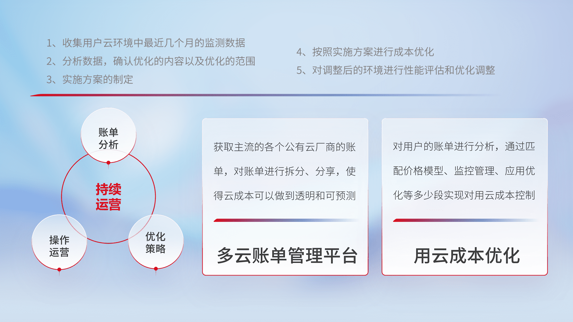 通过多云纳管,,,,以统一的资源数据模型把客户的云资源进行抽象和封装,,,进而实现对多云资源的统一操作,,,,保障云资源管理的可靠性、、、、稳定性与可用性。。量身定制化运维内容,,,,配置、、开发运维、、、补丁管理、、、、备份、、、、监控、、、、认证和访问管理、、审计和日常巡检等,,,,保障在用云过程中的可靠度,,,稳定度以及高可用率。。